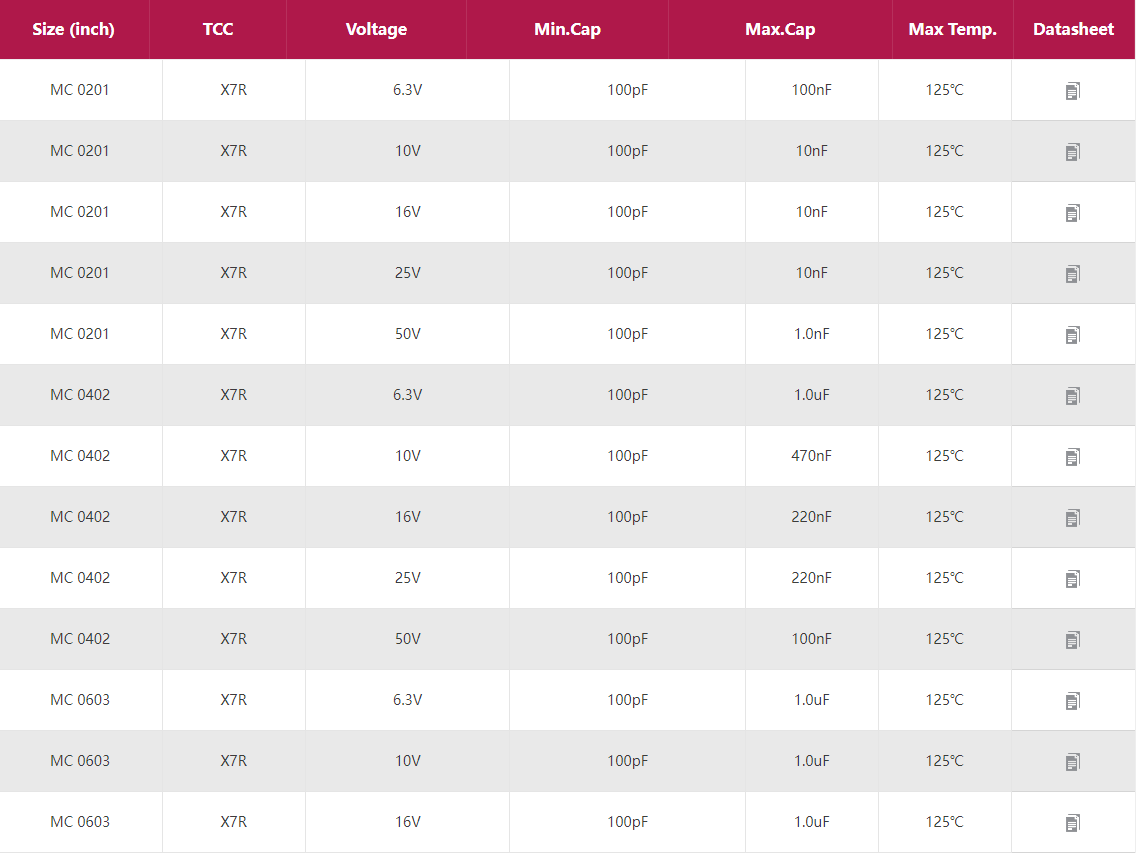 MC:X7R通用電容 產品型號:0201 0402 0603 0805